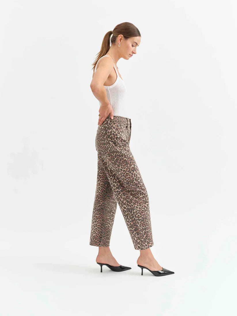 Make a statement in the print of the season. The Westward in Cool Cat is a high rise jean with a trending barrel leg silhouette and a tan and black cheetah inspired print. Featuring a cinched waist, bowed leg, and slightly tapered ankle.?