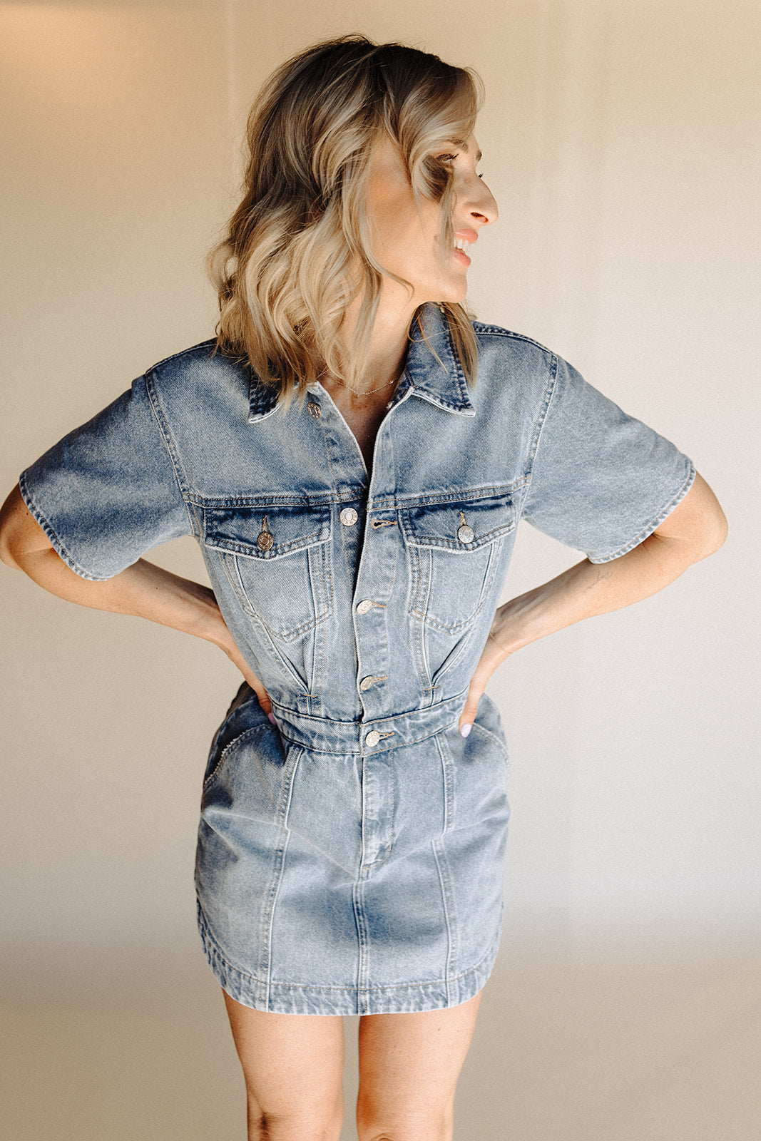An easy denim dress designed for everyday wear. Featuring a structured yet comfortable fit, short sleeves, and a button-front silhouette, this piece blends classic denim with a feminine shape. The defined waist and soft drape make it flattering, versatile, and effortless to style.